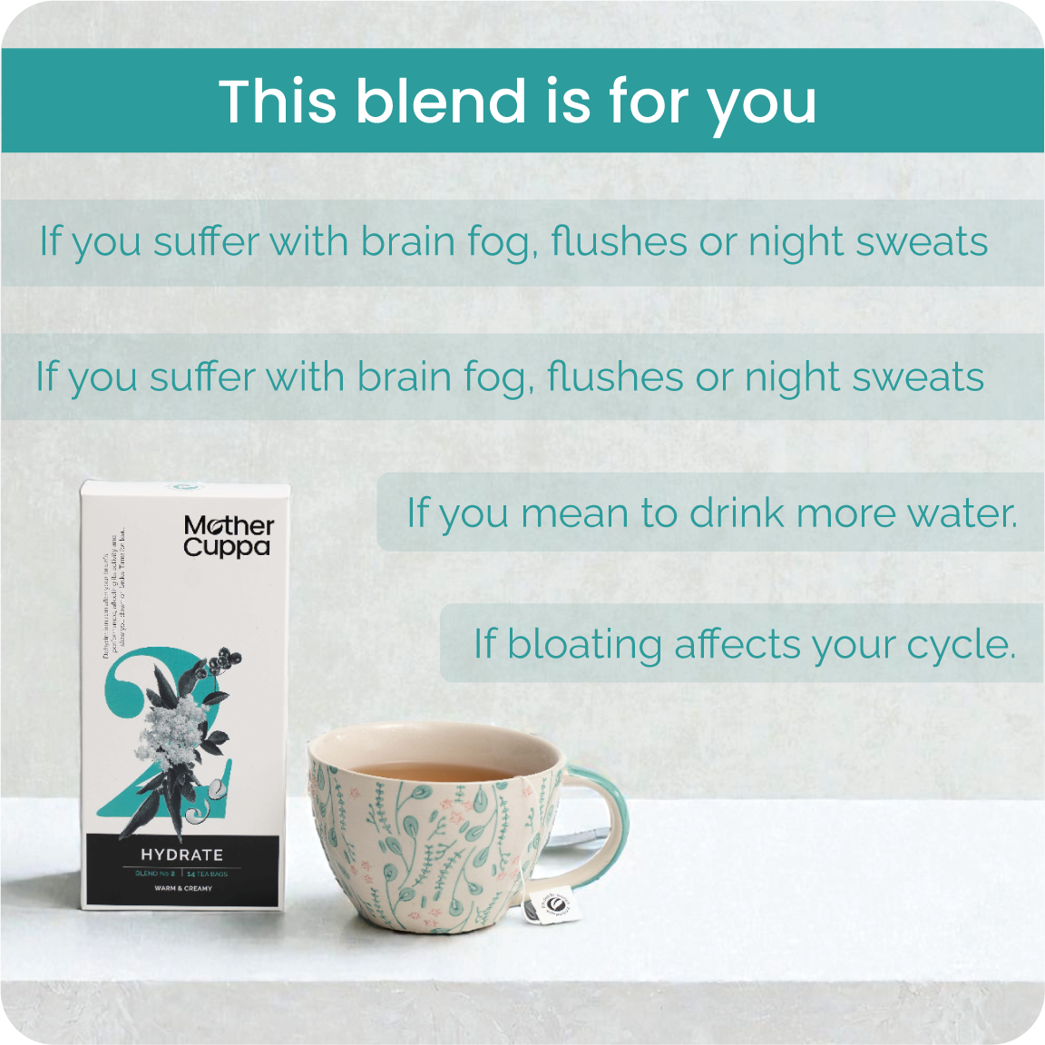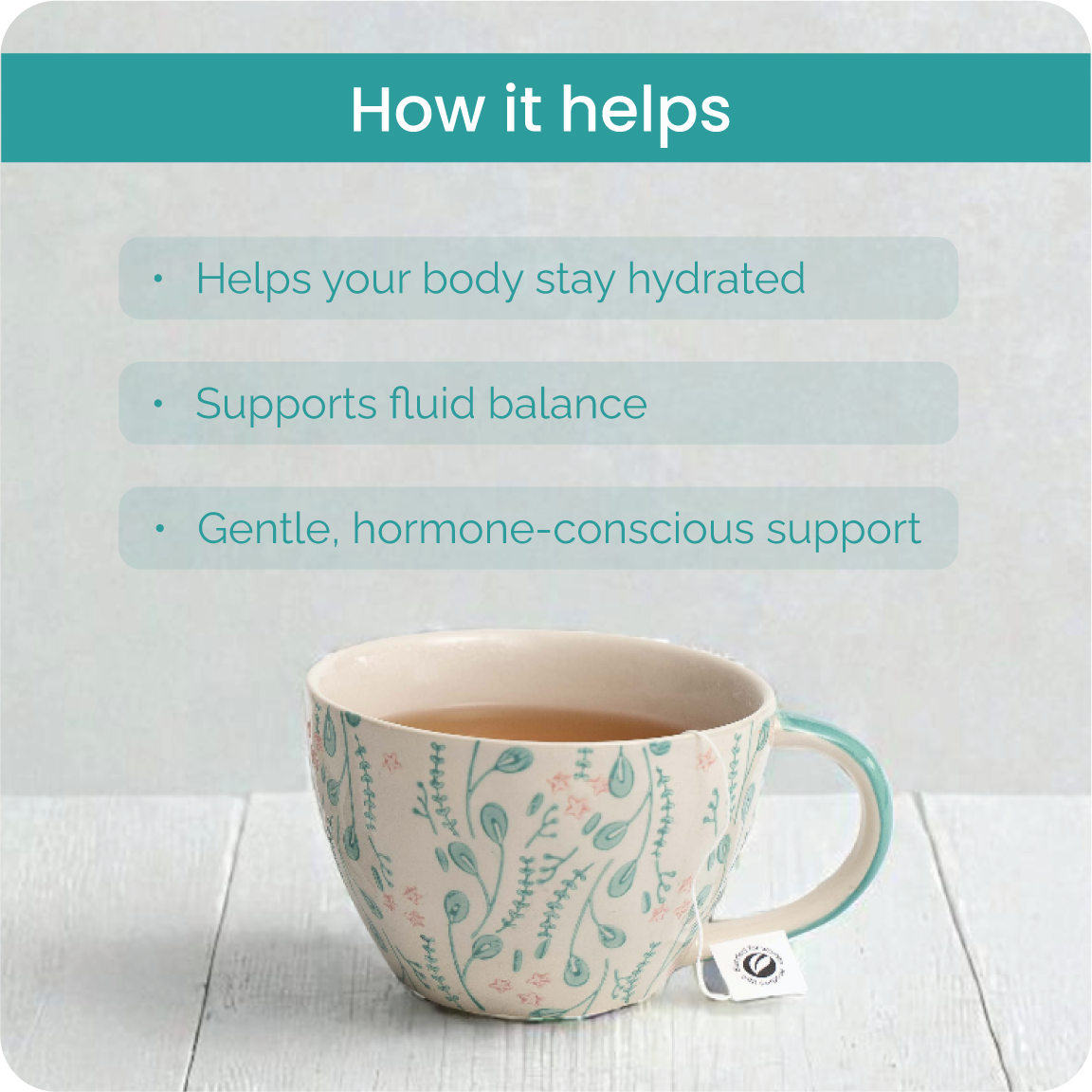 Hydrating herbal tea for women fulfills the need for maintaining proper hydration. Our Hydrate herbal tea is beneficial, especially during cycles, perimenopause, and menopause, when hydration patterns shift. It features natural flavorings, zero caffeine, and zero calories.
