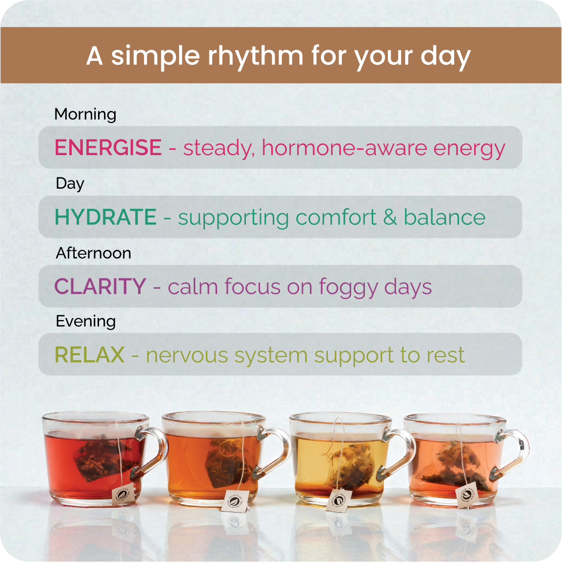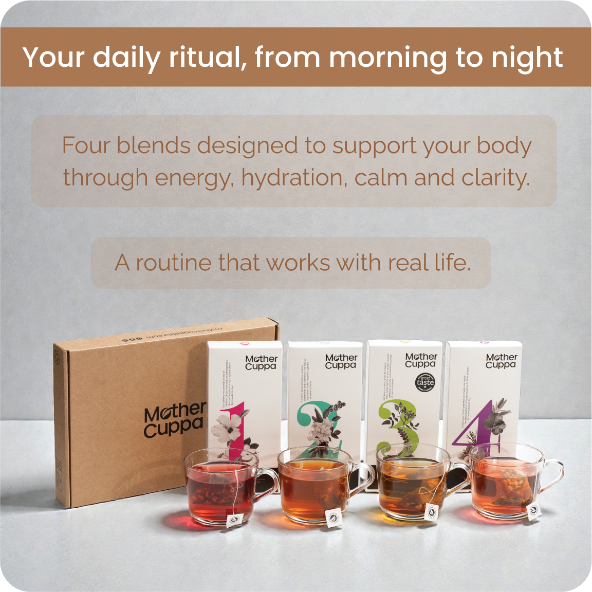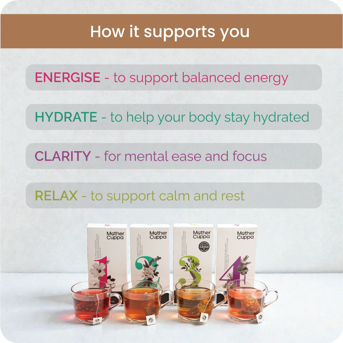 The Wellness Collection brings together our four core blends - ENERGISE, HYDRATE, RELAX and CLARITY - designed to support you from morning through to night.It’s the easiest way to experience Mother Cuppa, and the option most customers choose when they’re getting started. A blend for each part of the day: Energise for mornings; Hydrate for afternoons; Clarity for the mid afternoon slump and Relax for evenings.
