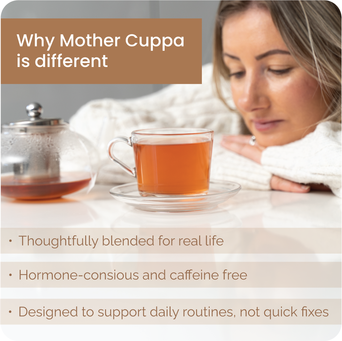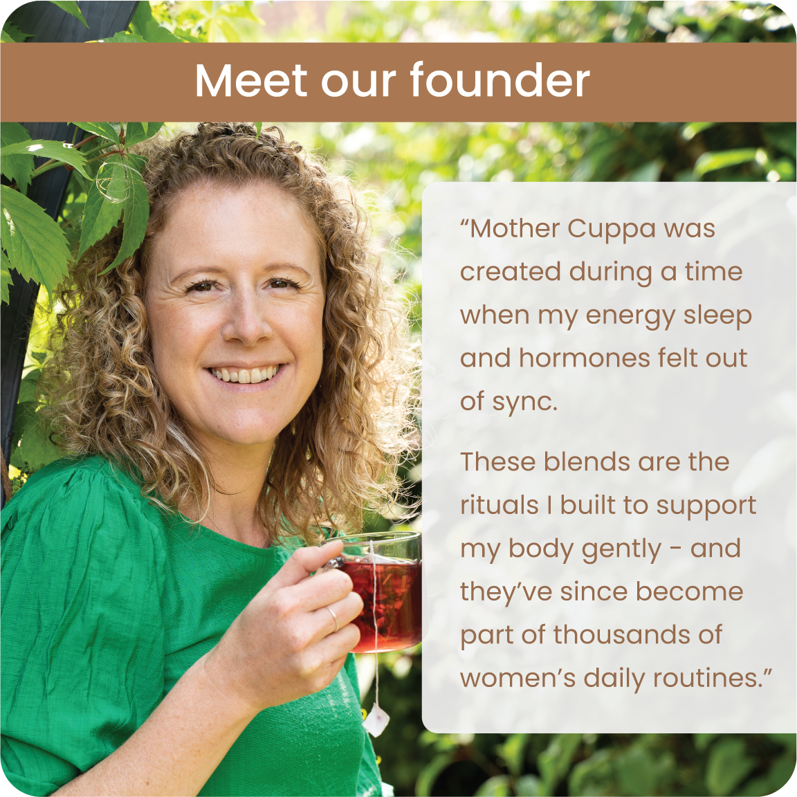 Mother Cuppa’s Wellness collection has a tea for each step of the day. A box of 3 teas for Morning, afternoon and evening. Blended for women with purpose to their day, helping you to balance hormones and keep up with the pace of life.